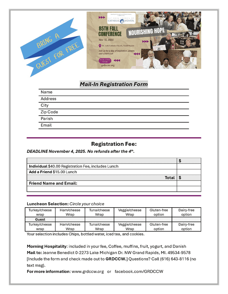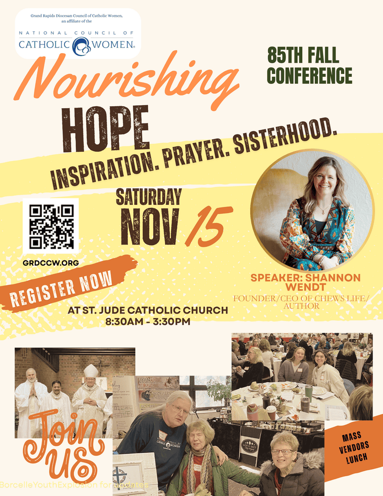 Transportation options: The diocese will be sponsoring two buses for this year’s Michigan March for Life in Lansing. One bus will pick up and drop off at Saint Isidore the Laborer Catholic Church in Grand Rapids, and the other pick up and drop off at Saint Francis de Sales, Norton Shores. The cost is $23 per person. To reserve your spot, please scan the QR code or contact Lauren Vandervort at lvandervort@GRdiocese.org or 616-246-0588.