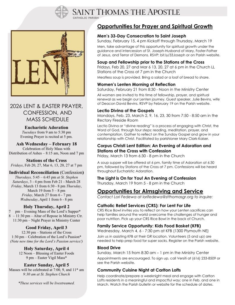 Lenten Schedule for Saint Thomas the Apostle Parish
